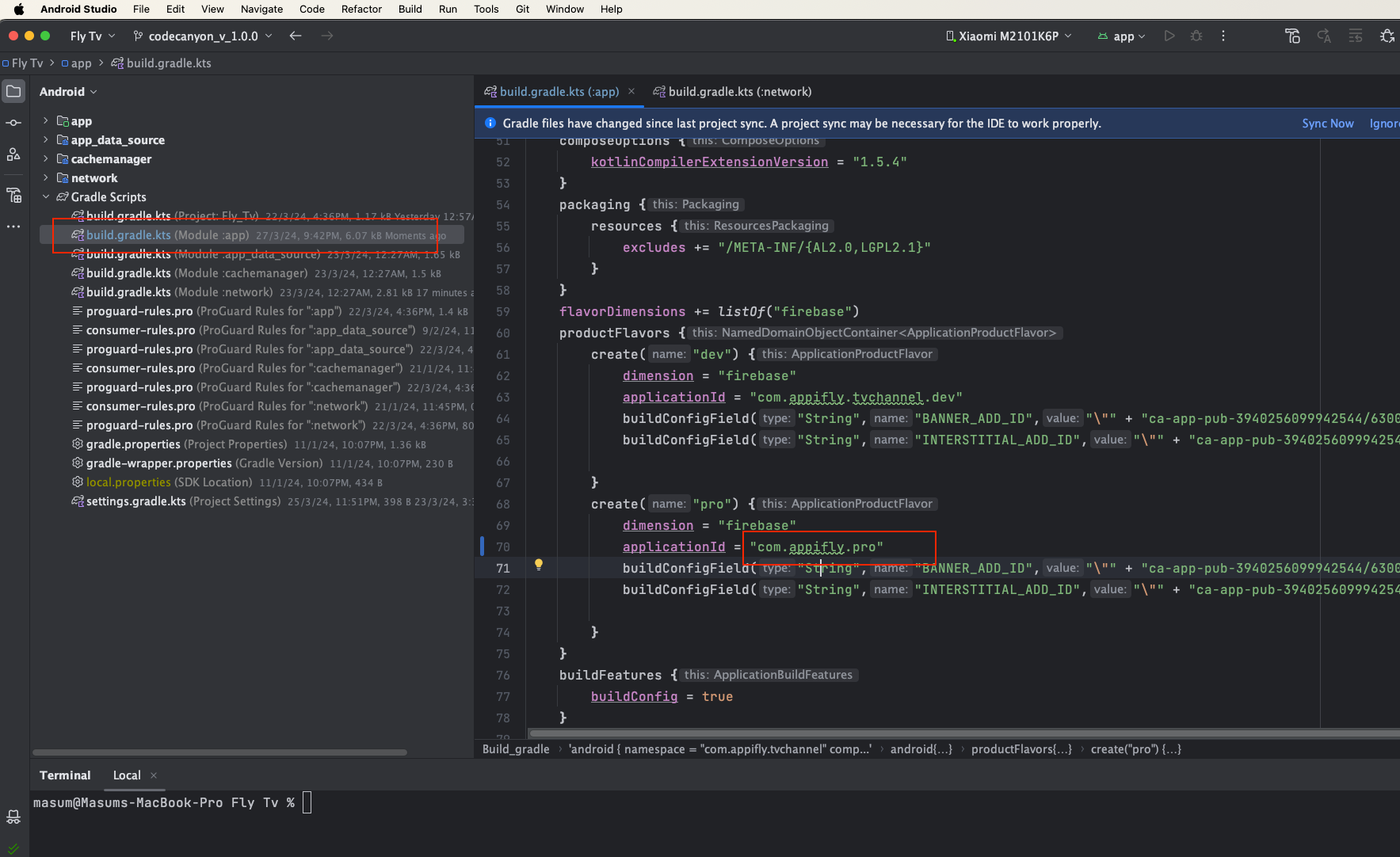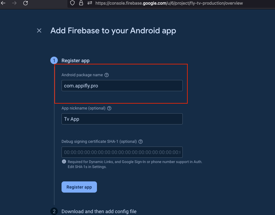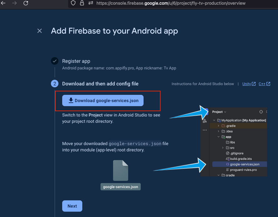 Follow the prompts to register your app, including providing the (applicationId) you've set in your app's build.gradle.kts product flavor pro block.