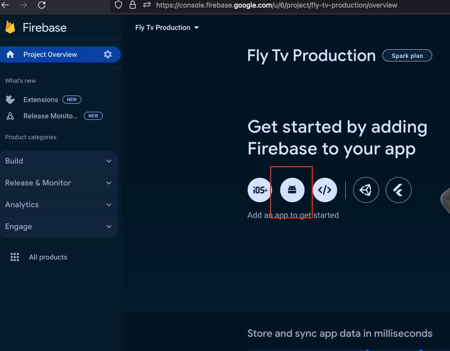 Click on the "Android" icon to add your Android app to the Firebase project.