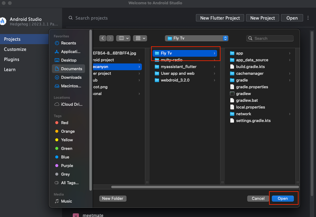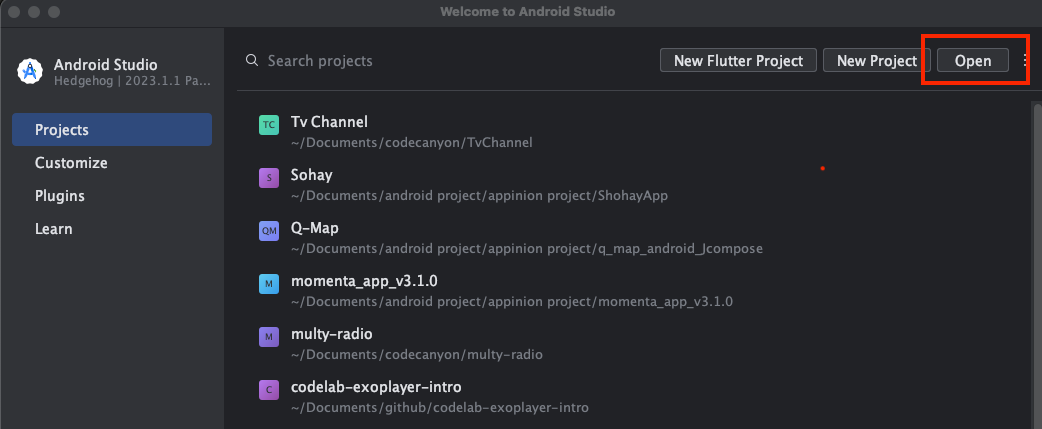 After Installation, open the Android studio and click on the open button to open your Fly TV App project from your computer which location that you downloaded product from codecanyon .