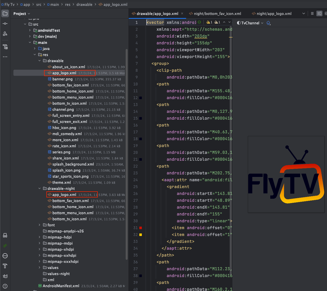 change app_logo.xml from drawable .this resource is used in main topbar . replase it by the same name .drawable and also from drawable night folder .