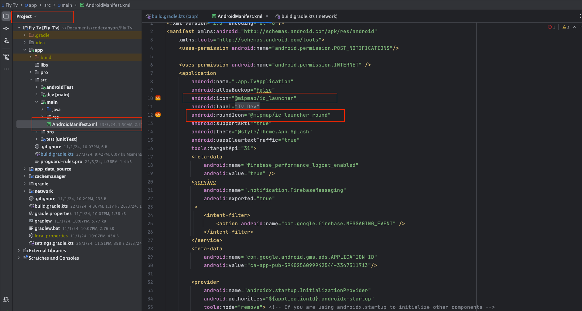 Here is the AndroidManifest.xml file in app and call the app icon from here you can also call the app icon from the drawable folder if you store the app icon in the drawable folder.switch the the top left option Android to project if you face any problem to find AndroidManifest.xml file .