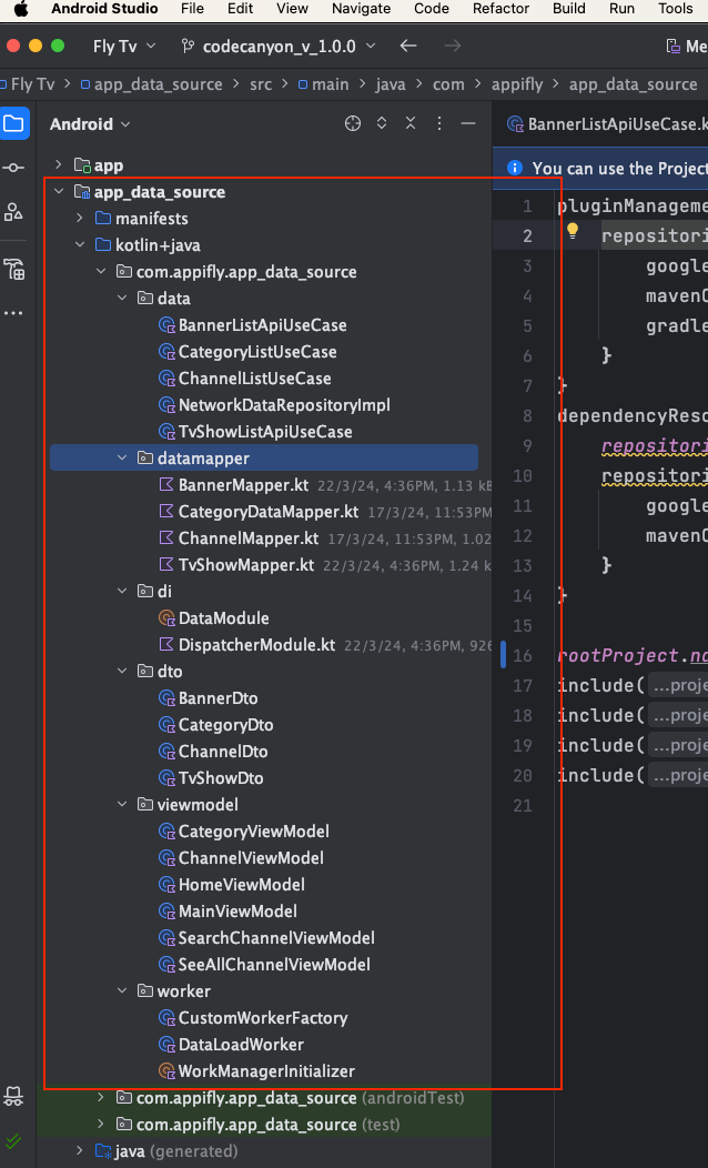 The app_data_source module is responsible for manipulating all app data, including ViewModel setup and mapping data between the network, CacheManager, and UI views. The ViewModel also handles business logic and manages data flow to the UI, facilitating communication with the UI layer in the main app module.